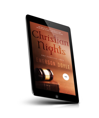 “A gavel resting on a book with a cover displaying "Christian Nights" and "Emerson Doyle" in bold text. Warm color palette.”
