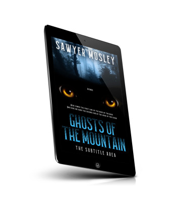 “Mysterious forest scene with glowing eyes, featuring the title "Ghosts of the Mountain" in blue text.”