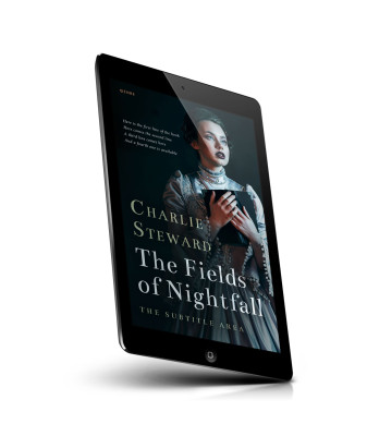 “A woman in vintage attire holding a book, with a dramatic and moody backdrop.”