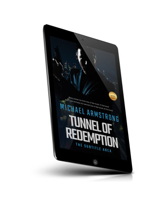 “Silhouette of a person holding a gun against a cityscape backdrop, book titled "Tunnel of Redemption."”