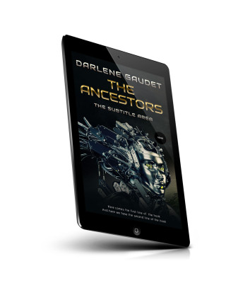 “A sci-fi book cover featuring a futuristic, robotic head with glowing eyes against a starry background.”