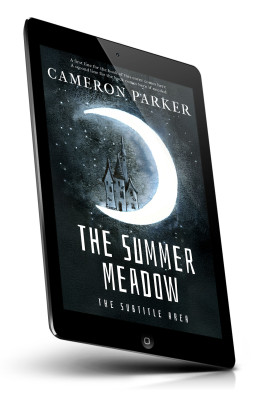 “A castle silhouette inside a crescent moon against a dark, textured background.”