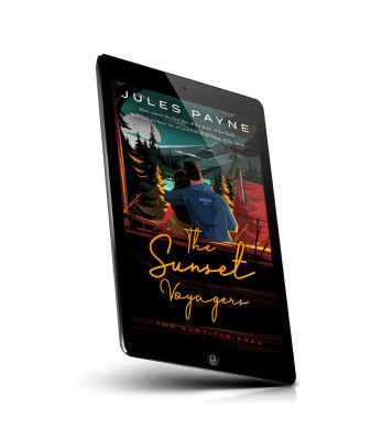 “A couple embraces, overlooking a mountainous landscape with a cabin and pine trees at sunset.”