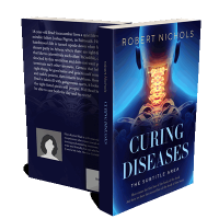 “A blue-toned image of a human head and spine with an overlay of glowing vertebrae.”