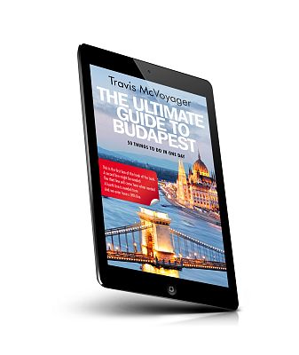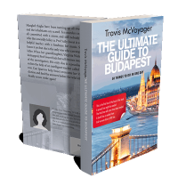 “A guidebook cover with a view of Budapest's Chain Bridge and Parliament building illuminated at dusk.”