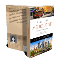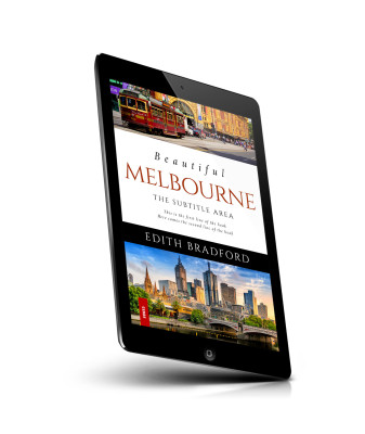 “A red tram and bustling city street above, with Melbourne’s skyline and riverfront below under a contrasting sky.”