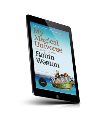 “A whimsical book cover with colorful animals on a boat and a serene blue sky in the background.”