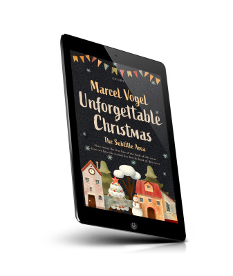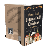 “Three houses with a decorated Christmas tree and a snowman, under a starry night sky. Festive bunting and stars adorn the scene.”