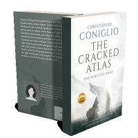 “A person holding a cracked piece of glass overlaying a mountainous landscape, with book title and author's name at the top.”
