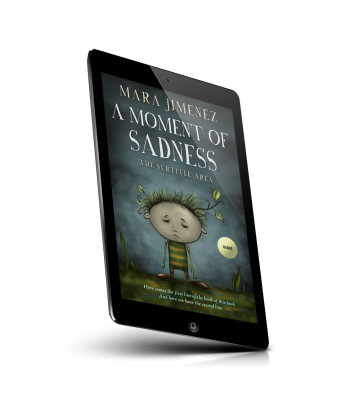 “A melancholic cartoon character stands amidst swirling clouds and plants on a book cover with a grayish blue background.”