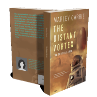 “A sci-fi book cover featuring an astronaut in a helmet with floating structures in a hazy, orange-hued sky.”