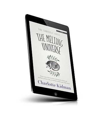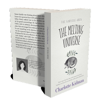 “A book cover with a minimalist design, featuring a curled-up cat surrounded by leaves and the title "The Melting Universe".”