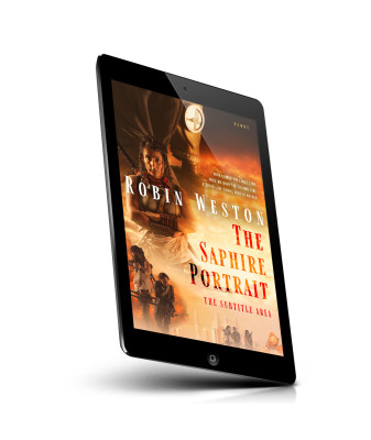 “A warrior woman stands with a cityscape and warriors below, in a dramatic, fiery setting. Book cover for "The Saphire Portrait."”
