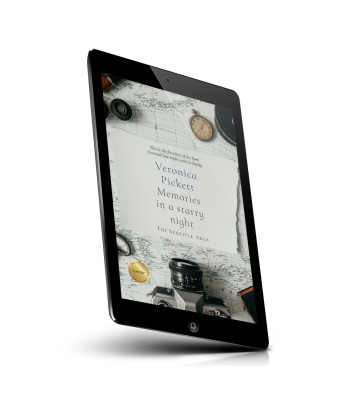 “Various travel items including a camera and compass surround a book cover on a vintage map background.”