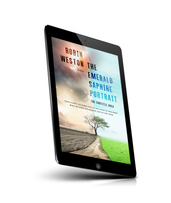 “A surreal landscape with a tree dividing a stormy, fiery sky on the left and a tranquil, sunny sky on the right, with text overlaid.”