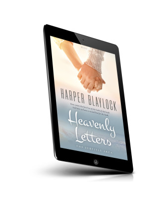 “Two people holding hands, blurred beach and ocean in the background. Book cover titled "Heavenly Letters" by Harper Blaylock.”