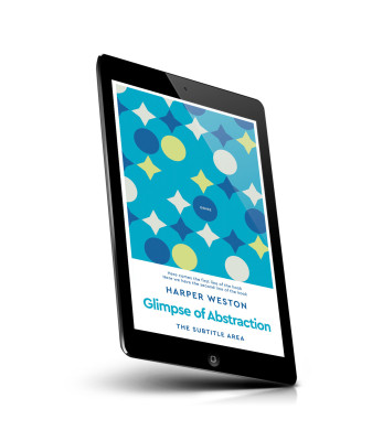 “A blue book cover with geometric shapes and stars, "Harper Weston" and "Glimpse of Abstraction" at the bottom.”