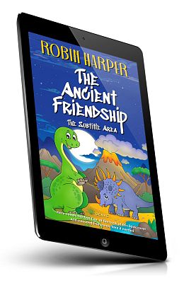 Other keywords revelant to this premade cover are colorful, clouds, stars, friendship, smiling, trees, children, mountains, playful, night sky, dinosaur, volcano, green dinosaur, illustration..
