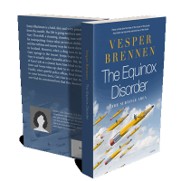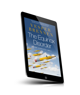 “A book cover featuring the title "The Equinox Disorder" and pencils flying through a cloudy sky.”