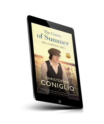 “A man in a vintage outfit and hat stands against a faded urban background, with book text overlaying the image.”