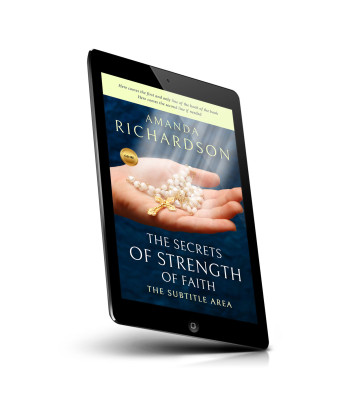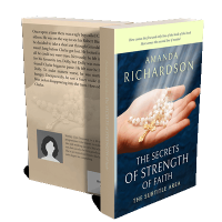 “A hand holding a rosary with a golden cross against a blue background. The cover of a book by Amanda Richardson titled "The Secrets of Strength of Faith."”