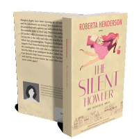“A woman in a pink dress and red hair flies above a cityscape while holding a book and briefcase. Beige background with book title in pink.”