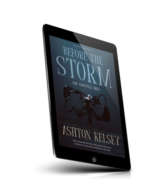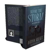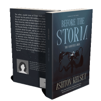 “A dark, dramatic book cover with a figure seemingly floating or dancing, surrounded by flowing fabric, titled "Before the Storm."”