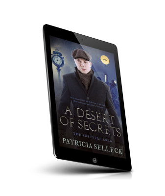 “A man in a coat, scarf, and flat cap stands against a backdrop of a clock and a train at night. Book title "A Desert of Secrets" is prominent.”