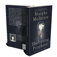 “A light bulb with a small figure inside on a dark background. Book title: Sheltering Prophecy. Author: Murphy McIntyre. Subtle design.”