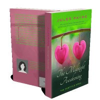 “Two heart-shaped pink flowers hanging on a green stem above a book title, set against a blurred background.”