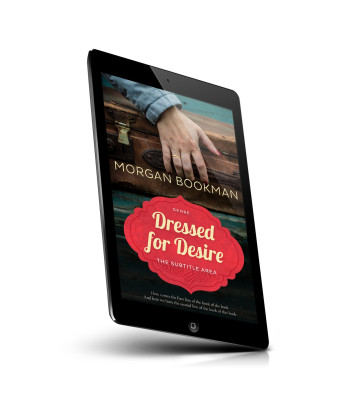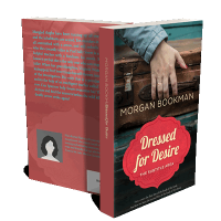 “A hand with a wedding ring rests on an old suitcase. Below is a decorative red label with details about a book titled "Dressed for Desire."”