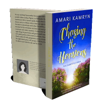 “A book cover with a bright sky, blooming purple flowers, and elegant yellow script font for the title.”