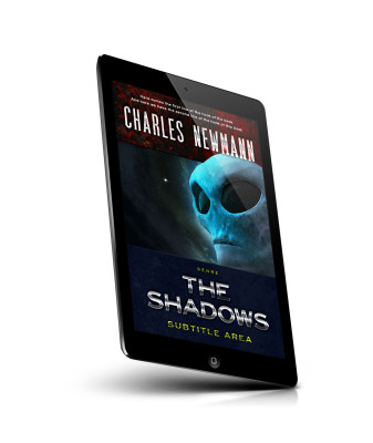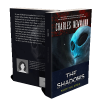 “An alien with large eyes gazes against a cosmic backdrop, beneath a bold title, "THE SHADOWS" by Charles Newmann.”