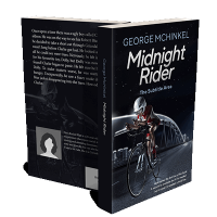 “A cyclist in red and white gear races on a road with a cityscape and bridge in the background, under a starry night sky.”