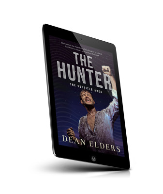 “A rugged man with a clenched fist appears determined against a dark background, drenched in sweat and grime. "The Hunter" is in bold text above.”