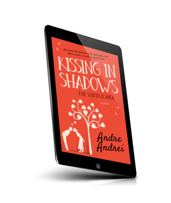 “A red book cover with silhouettes of a couple and a tree with heart-shaped leaves. Birds are flying around.”