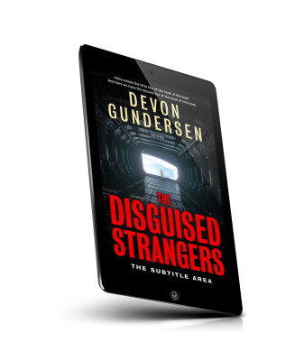 “A lone figure stands at the end of a futuristic, dark hallway with a distant view of Earth. The title "The Disguised Strangers" is prominent.”