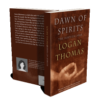 “A textured book cover with a hand gesture. Title in large font: "Dawn of Spirits." Subtitles and author's name in smaller fonts.”