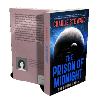 “A sci-fi book cover with a dark planet against a starry background and bold blue title text.”