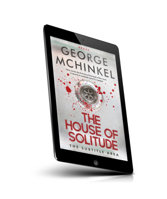 “A grungy metal surface with blood spatter and a speaker in the center. Text includes the book title and author.”