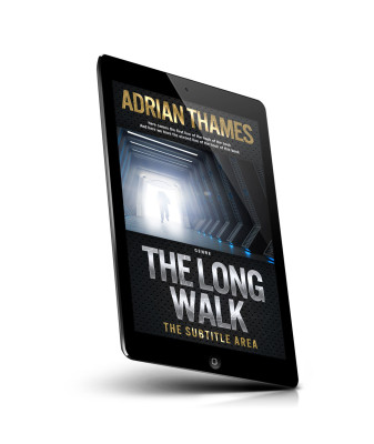 “An illuminated figure walks through a futuristic, metallic corridor with the book title prominently displayed.”