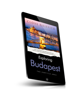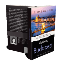 “A nighttime view of Budapest with illuminated buildings and a bridge over a river. Book cover title: Exploring Budapest.”