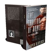 “Man in Roman attire holding a sword, with a dramatic background. Book cover design.”