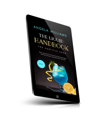 “A blue cocktail garnished with lemon zest and mint is on a dark background with text about a book titled "The Liquid Handbook."”