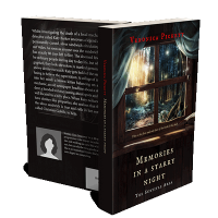 “A window view of a starry forest night, framed by curtains, with a book and a "Genre" badge nearby.”