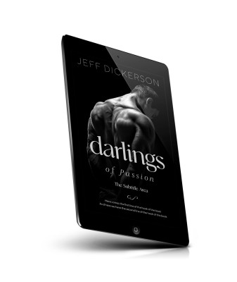 “A muscular man with his back turned, in grayscale on a book cover titled "Darlings of Passion."”
