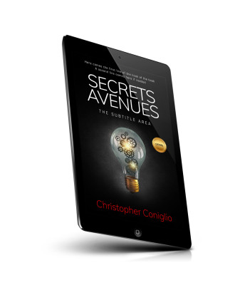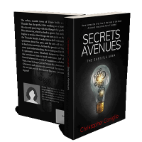 “Book cover with a light bulb filled with gears. Title "Secrets Avenues" in large white font and the author's name in red at the bottom.”