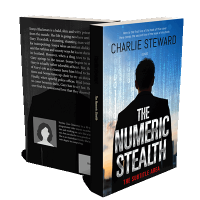 “A man stands facing a background of digital binary code against a twilight sky, with a bold title and subtitle below.”
