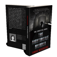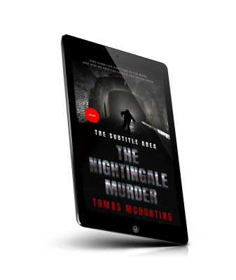 “A shadowy figure runs down a dark tunnel with brick walls. The text areas suggest it's a book cover for a murder mystery.”