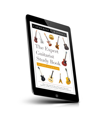 “Cover of a book titled "The Expert Guitarist Study Book," featuring various guitars and a genre badge.”
